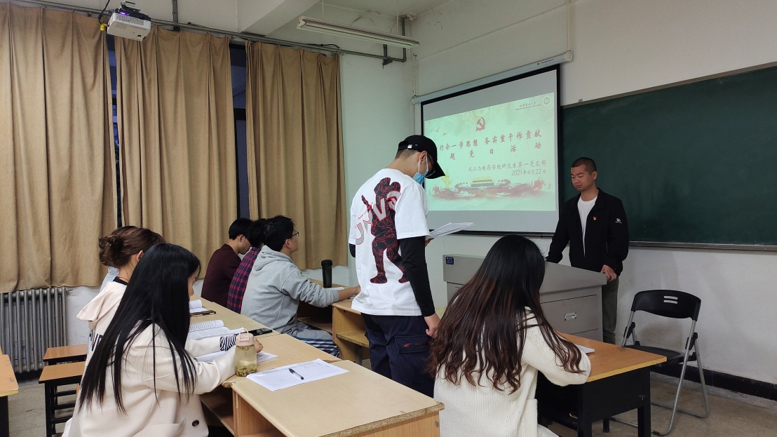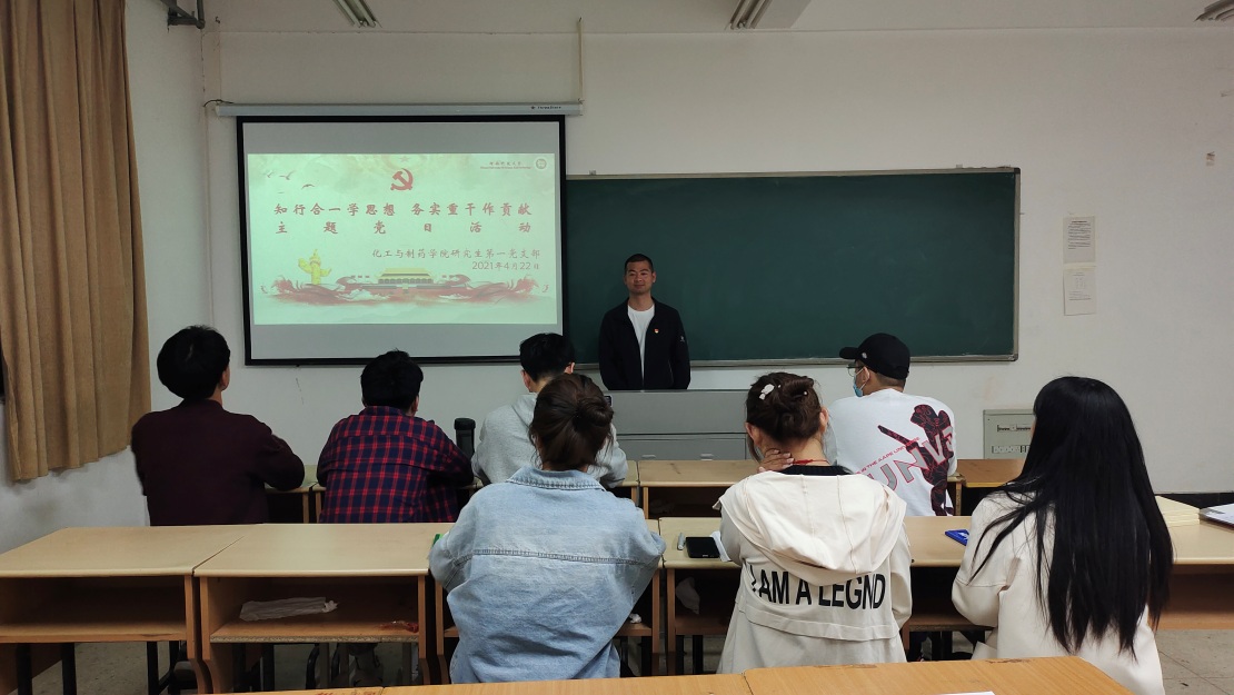 2021年4月22日,化工与制药学院研究生第一党支部在工科5-202教室开展4月份主题党日活动,活动由党支部书记孙亚飞主持,活动主题为“知行合一学思想 务实重干作贡献”。集中学习了《习近平谈治国理政》第三卷、《论中国共产党历史》中部分章节内容。